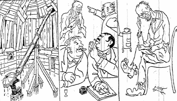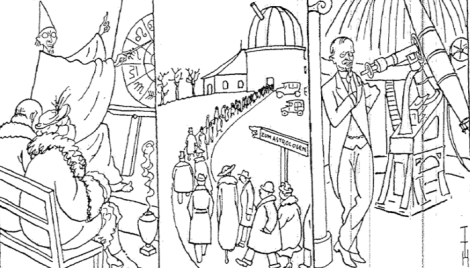 On top of this, economic crisis troubled the country. In this difficult climate, scientists had to find new strategies to present their research. A German satire cartoon from 1921 ironizes on this situation [see image below]:[1] There is no longer any money for science, and the astronomer’s observatory is falling apart. The professor asks the government for funding, but is rejected. In desperation, he needs to think up a plan. The plan then follows: scientific astronomy may not be popular anymore, but astrology is more popular than ever! The professor sets up an astrological practice, sells horoscopes to war profiteers, and makes lots of money. Finally, he has the funds to rebuild his observatory and continue science as usual.