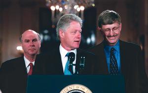 Clinton announces that God’s language of life has been revealed. The head of the Human Genome Project, Francis Collins (an Evangelical Christian), smiles contently in the background.
