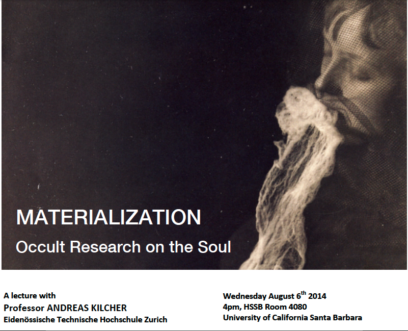 This summer, the President of ESSWE, Andreas Kilcher, has been located at Stanford University. With me being based at UC Santa Barbara, we found a great opportunity to arrange a small esotericism event at the UCSB Religious Studies Department and the Religion, Experience and Mind Lab group that I am working with. So if you are in the area, consider this event on August 6th: Andreas Kilcher lectures on “Materialization: Occult Research on the Soul”. Scroll down for the abstract (or download the flyer here):